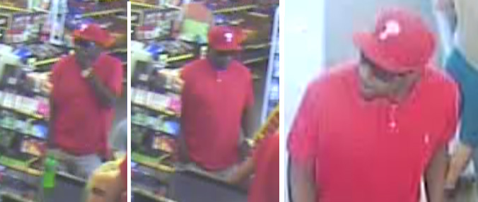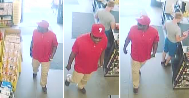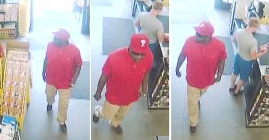 Flomaton Police have obtained surveillance footage of the suspect entering two different businesses. He was described as a black male about six feet tall, wearing khaki pants, an untucked red polo-style shirt, black sunglasses, a gold colored watch on his left wrist and a red hat with the letter “P” on it, possibly a Philadelphia Phillies baseball hat. No description of his vehicle is available.