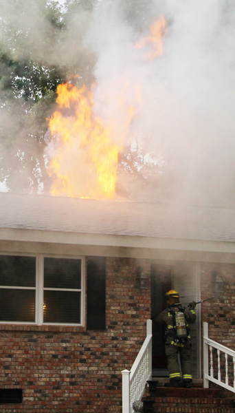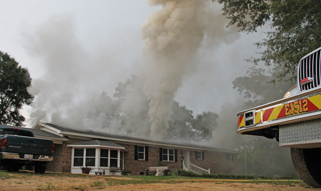 Pictured top and inset: Firefighters make entry into a burning home near Davisville Monday afternoon. NorthEscambia.com photos, click to enlarge.