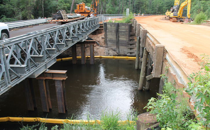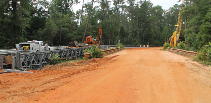 The traffic count on Pineville Road, according to FDOT data, is 40 vehicles per day. That’s less than two vehicles per hour, on average, all day. Many of those, the resident acknowledged, are likely forestry workers, hunters or “kids going to the creek”. But those 40 drivers per day won’t be inconvenienced by a detour on Pineville Road with the construction of a temporary steel bridge opening Wednesday that includes guardrails and paved approaches on the lonely dirt road.