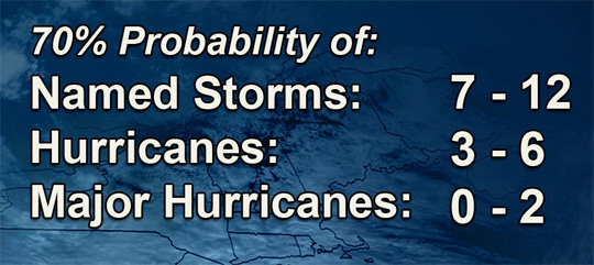 The updated hurricane season outlook, which includes the activity to-date of hurricanes Arthur and Bertha, predicts a 70 percent chance of the following ranges: 7 to 12 named storms (top winds of 39 mph or higher), including 3 to 6 hurricanes (top winds of 74 mph or higher), of which 0 to 2 could become major hurricanes (Category 3, 4, 5; winds of at least 111 mph).