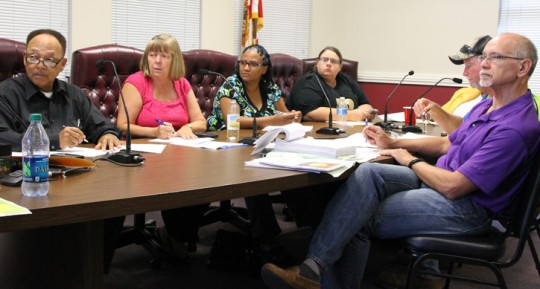 Pictured: The Century Town Council and accountant Robert Hudson (purple shirt) discuss the council’s budget Thursday afternoon. NorthEscambia.com photo, click to enlarge.