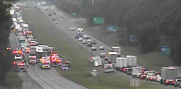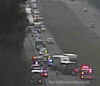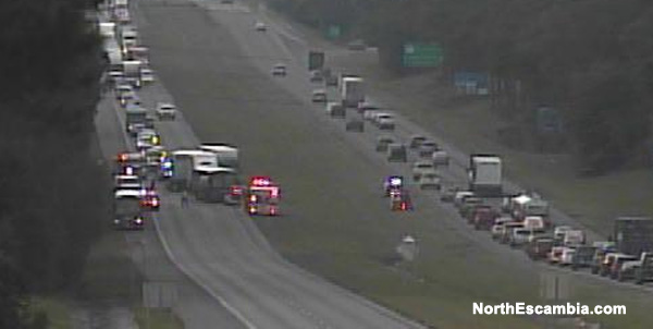 Pictured top and inset: The first emergency units arrive on scene at a Greyhound bus accident on I-10 this afternoon east of Pine Forest Road. Pictured below: the scene a short time later. Images for NorthEscambia.com, click to enlarge.