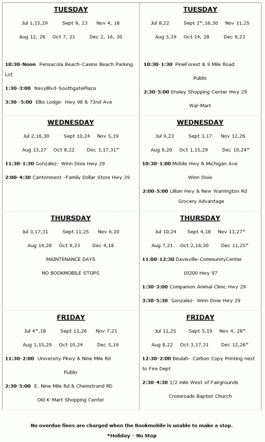 The Bookmobile schedule below, provided by the West Florida Library, shows stops for the remainder of the year. Click the schedule to enlarge and print.