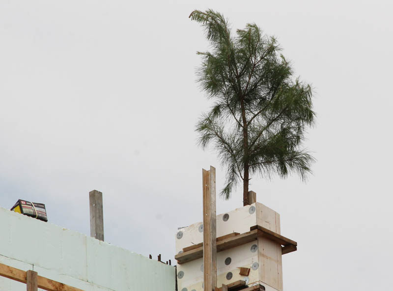 A pine tree placed Friday on the building’s highest point marked the symbolic “topping out” of the project, following a construction tradition.