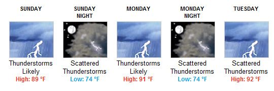 - Sunday Night Scattered showers and thunderstorms, mainly before 1am. Mostly cloudy, with a low around 74. Southwest wind around 5 mph becoming calm in the evening. Chance of precipitation is 30%.