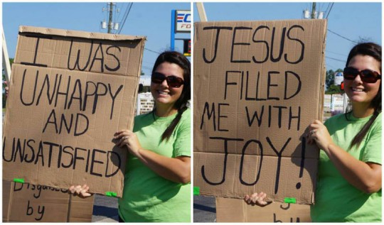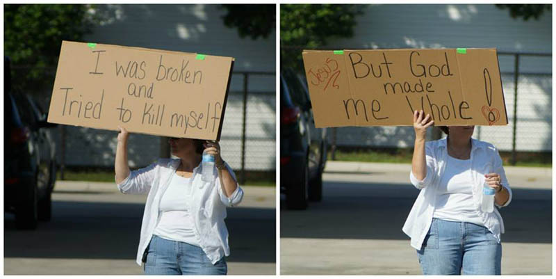 “I was broken and tried to kill myself,” read one side of a piece of cardboard a woman stood holding alongside Highway 29. “But God made me whole!”
