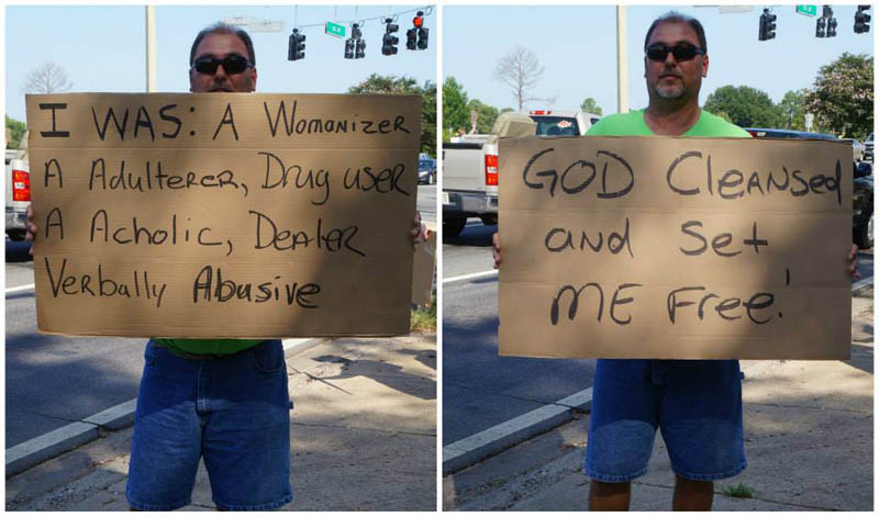“I was a womanizer, a[n] adulterer, drug user, acholic [sic], dealer, verbally abusive,” tough words for a grown man to admit on one side of his sign. The other: “God cleansed and set me free.”