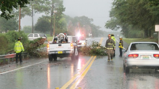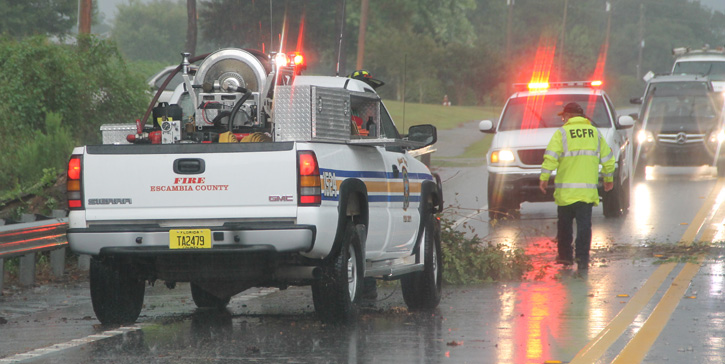 An afternoon storm in the Walnut Hill area downed a large dead tree, blocking most of both lanes of Highway 97. Crews from the Walnut Hill Station of Escambia Fire Rescue worked to remove the tree from the highway. NorthEscambia.com photos, click to enlarge.