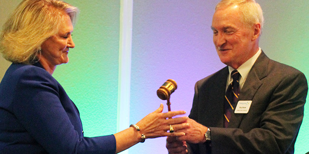 Pictured top: Gary Huston (right), 2013-2014 Chair of the Greater Pensacola Chamber Board of Directors, officially passes the gavel to the 2014-2015 Chair Carol Carlan (left) during ther chamber’s annual meeting Thursday. Photo for NorthEscambia.com, click to enlarge.