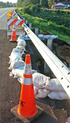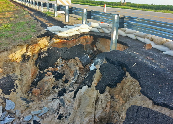 Back on May 15, the shoulder of Highway 97 about a mile south of Ernest Ward Middle School collapsed in an existing 50-foot deep gully after a drainage pipe separated and undermined the shoulder. About a month later, the situation worsened, with part of the paved shoulder falling into the hole, prompting temporary repairs by the Florida Department of Transportation.