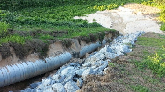 But now the recently replaced slope into the gully has washed away, exposing the newly replace drainage pipe, and the paved shoulder of the road has once again collapsed into the deep hole.