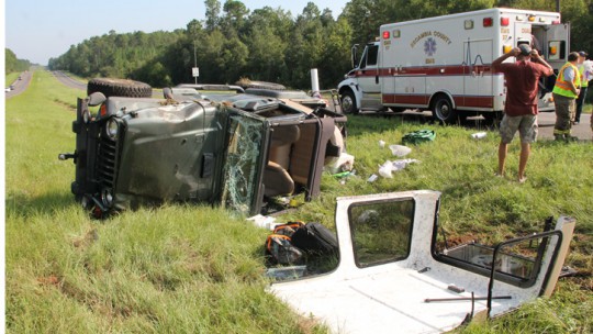 The accident happened about 8:45 a.m. on Highway 29 just north of Barrineau Park Road. The driver of a Jeep lost control and flipped into the median, with the vehicle coming to rest on its side.