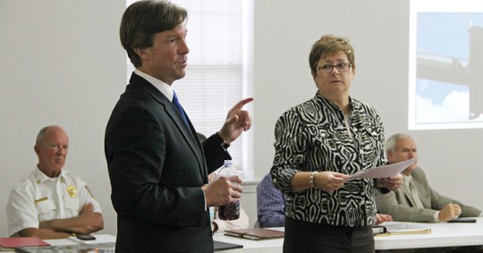 Pictured top: Escambia County District 5 Commissioner Steven Barry explains the use of LOST dollars on road projects as Director of Public Works Joy Blackmon listens. Pictured inset: A presentation on LOST was given during a public meeting Monday evening at the Walnut Hill Community Center. Pictured inset: Residents listen to the presentation. NorthEscambia.com photos, click to enlarge.
