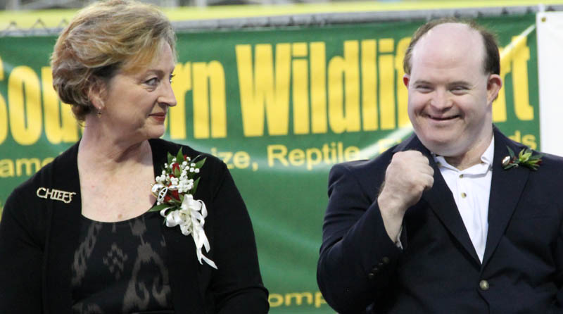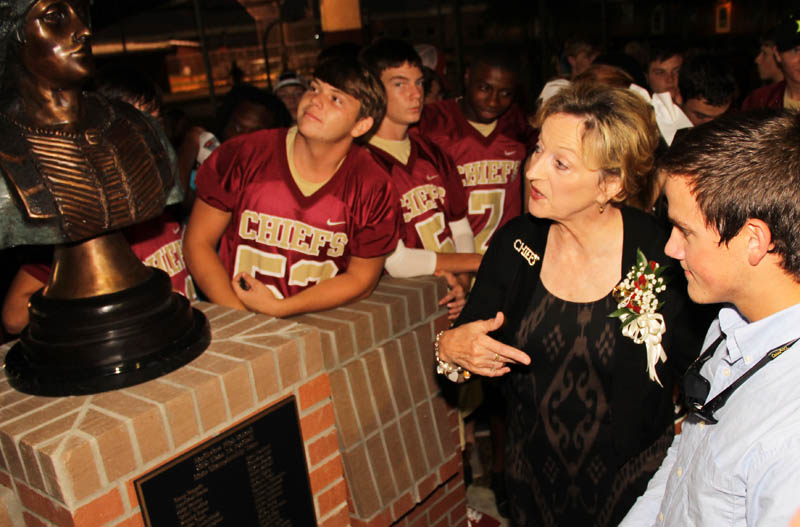 Pictured top: A new sign marks the entrance to Tommy Weaver Memorial Football Stadium on the campus of Northview High School. Pictured below: Principal Gayle Weaver, wife of Tommy Weaver, and Chad Smith, president of the 2013 Northview Class of 2013, admire a newly dedicated chief statute outside the school’s new weight room. Pictured below, middle: Gayle Weaver and son Toby. Pictured bottom: School Superintendent Malcolm Thomas speaks. NorthEscambia.com photos, click to enlarge.