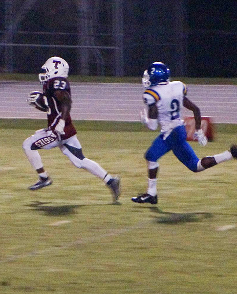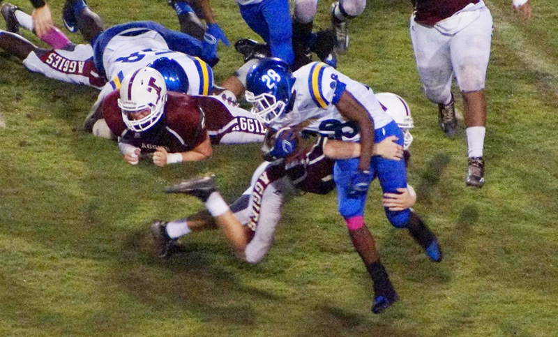 Pictured top: The Wildcats attempt to stop the Tate Aggies Friday night at Pete Gindl Stadium in Cantonment. Pictured inset: Tate’s Alondo Thompkins (#23) gained 189 yards for the Aggies Friday night. NorthEscambia.com photos by Keith Garrison, click to enlarge.