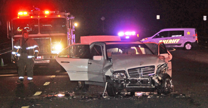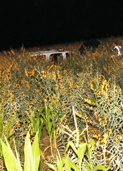 Pictured top: This Mercedes pulled into the patch of an Escambia County Sheriff’s deputy Saturday night at the intersection of Highway 29 and Highway 97 in Molino. Pictured inset: The deputy’s vehicle came to rest 52 feet into a sun hemp field. Pictured below: Damage to the deputy’s Tahoe as seen after it was removed from the field. Pictured bottom: The Mercedes came to rest in the intersection. NorthEscambia.com photos, click to enlarge.