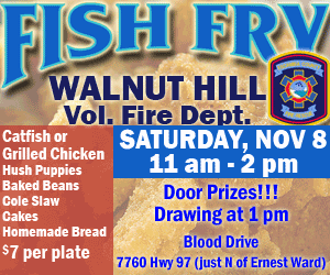 The Walnut Hill Volunteer Fire Department’s 45th Annual Fish Fry will be held Saturday from 11 a.m. until 2 p.m. at the Walnut Hill Fire Station on Highway 97. Plates will be $7 each with your choice of catfish fillets or grilled chicken, plus baked beans, cole slaw, hush puppies, homemade bread and cake. There will also be drawing for door prizes beginning at 1 p.m. and a live auction.