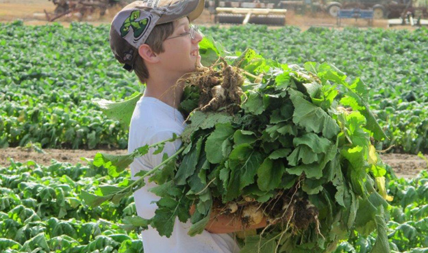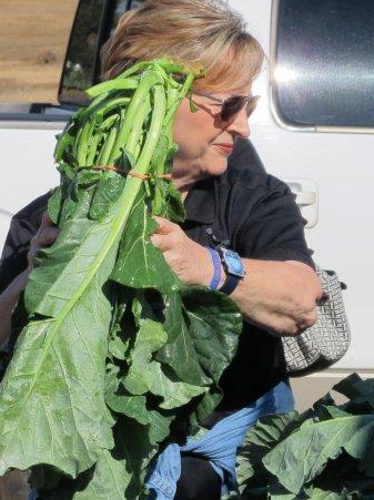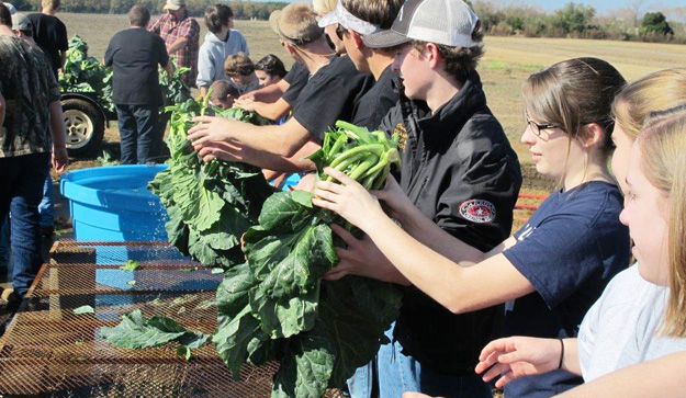 The greens were harvested in assembly line fashion — one student picking the greens, another bundling them with a rubber band and passed student to student to a waiting transport vehicle. Then teams of students worked to wash the greens.