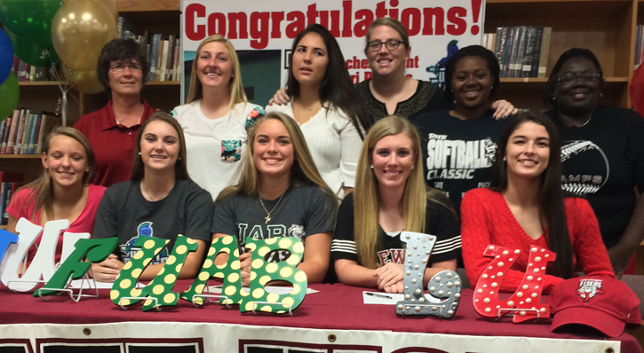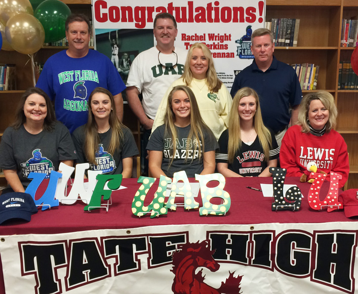Pictured top: Tate’s softball signees and their parents. (front, L-R) Diana Wright, Rachel Wright, Tori Perkins, Lauren Brennan, Dorice Brennan, (back, L-R) Marty Wright, Greg Mason, Chris Mason and Mike Brennan. Pictured below: The Tate softball seniors. Pictured bottom. The individual signees and their parents. Photos for NorthEscambia.com, click to enlarge.