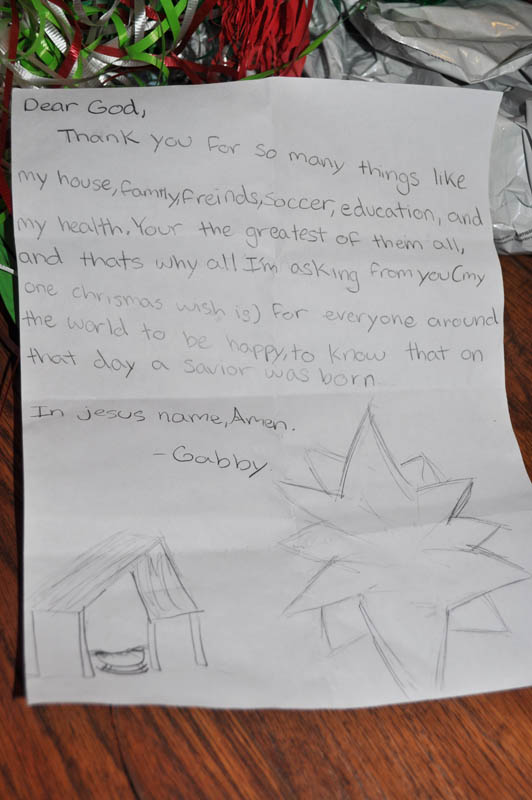 Gabby chose to write her letter to God rather than Santa, thanking Him for her house, family, friends, soccer, education and health. And her Christmas wish to God? “For everyone around the world to be happy to know that on that day a Savior was born.”