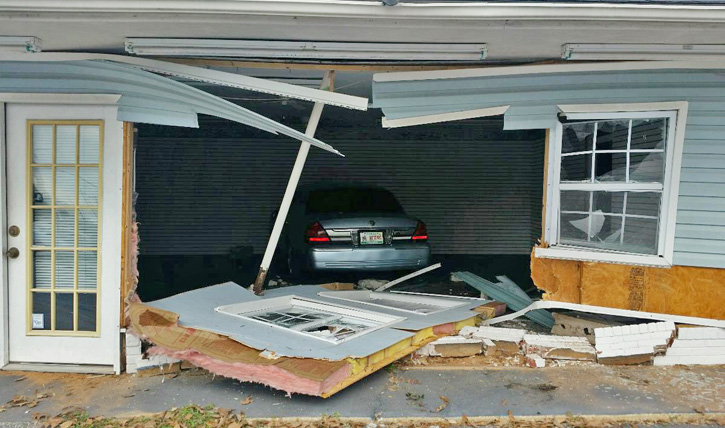 The accident happened at the intersection of Pine Forest Road and Highway 297A, near the rear of the Publix store. The vehicle entered the building and knocked out the rear wall of the concrete block building. The vehicle came to rest inside the building.
