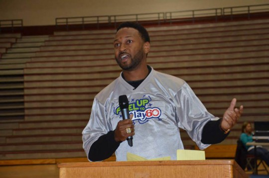 Retired NFL player Leigh Torrence spoke to students about healthy exercise at Tate High School.