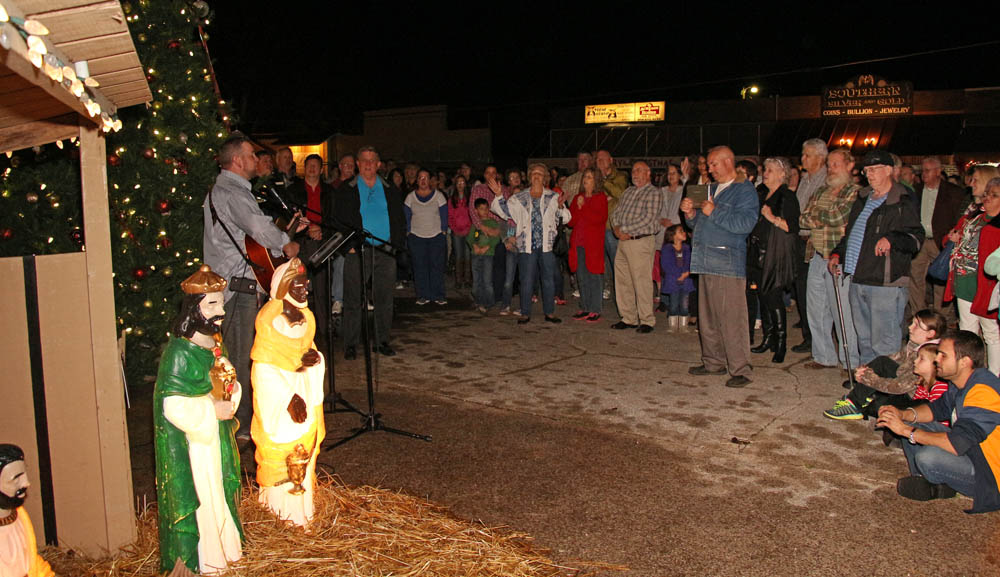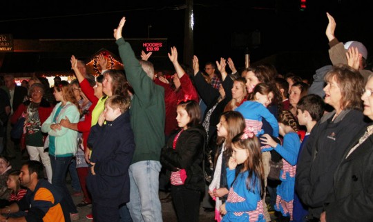 The words to the classic Christmas carol “O Holy Night” echoed across the heart of Jay Monday night as nearly 300 people gathered at a corner lot at the town’s only traffic light. A huge turnout for a town of about 575 people.