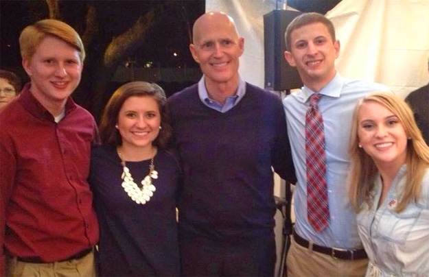 Pictured top: Gov. Rick Scott (center) with (L-R) Northview High student Mitchell Singleton and University of West Florida College Republicans members Haley Malone, Tyler Ward, and Shelby Williams Saturday night in a Pensacola “Jobs Jamboree” event. Photo for NorthEscambia.com, click to enlarge.