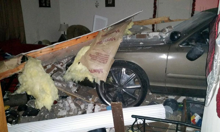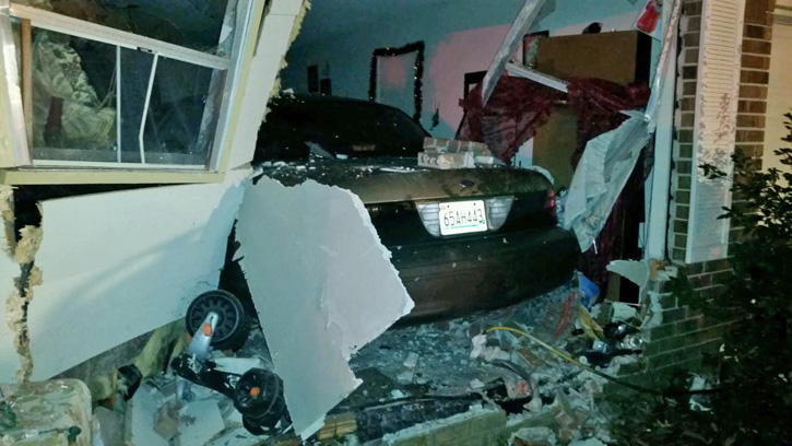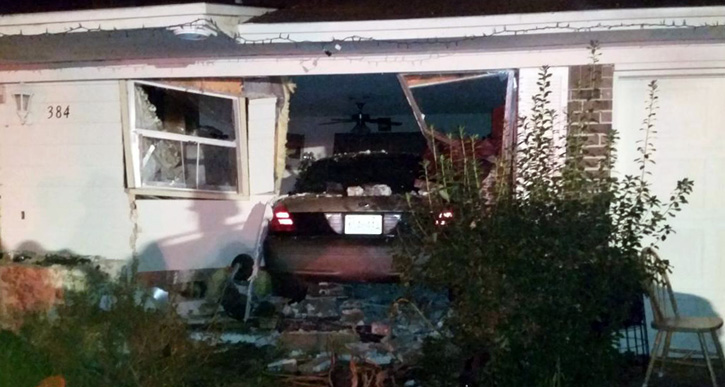 The vehicle came to rest complete inside the home on Petty Drive, off of Tate Road, about 4:15 a.m. The occupants of the home and the driver of the car were not injured.