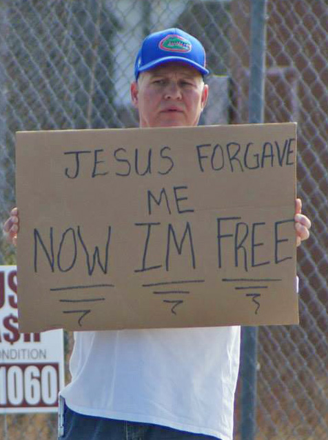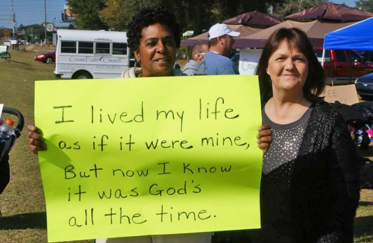 “Now God has given me life and a purpose! (You),” stated on sign. “Religion Sets Rules. Jesus Sets U Free,” proclaimed another. And another said, ” I was drowning in debt and sorrow of not having enough…my God has blessed me with joy, happiness and more than enough”.
