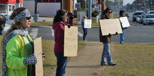 Members of CrossFaith Church in Molino presented their cardboard testimonies Saturday at Brent Lane and W Street. The church also prayed with passersby, gave away free coffee and offered free coats and blankets to those needing a helping hand.