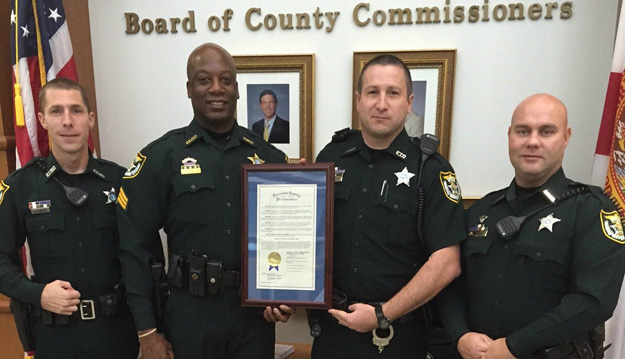 The Escambia County Commission recognized last week as First Responder Appreciation Week and issued a proclamation thanking area first responders and their families. Accepting the proclamation on behalf of the Escambia County Sheriff’s Office were four of the six deputies shot in the line of duty in the last six years. Pictured are: Deputy 1st Class Ryan Robinson, Sergeant Shedrick Johnson, Deputy Chad Brown and Deputy Jason Ates. (The two deputies shot in the line of duty not shown are Deputy Jeremy Cassidy and Deputy 1st Class Sam Parker.) Submitted photo for NorthEscambia.com, click to enlarge.