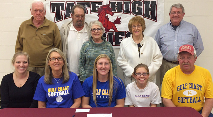 Tate High School senior Samantha Burks signed a letter of intent recently with Florida Gulf Coast Community College in Panama City. Joining her for the signing were here family Mark, Donna, Carla and Abbie; grandfather Waylon Burks, great uncle Donald Burks and grandparents Rebecca and Barry Millette. Photo for NorthEscambia.com, click to enlarge.