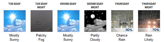 - Thursday A 30 percent chance of rain after noon. Partly sunny, with a high near 57. Northeast wind 5 to 10 mph.