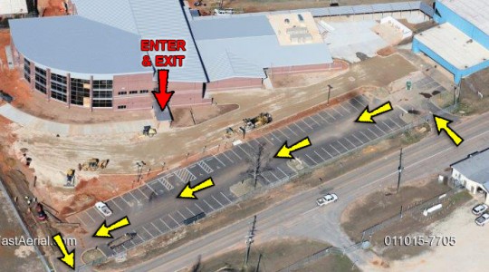 Pictured: The yellow arrows represent the parent line pick up and drop off at the new Ernest Ward Middle School. The entrance and exit to the school is marked with a red arrow. NorthEscambia.com graphic, click to enlarge.