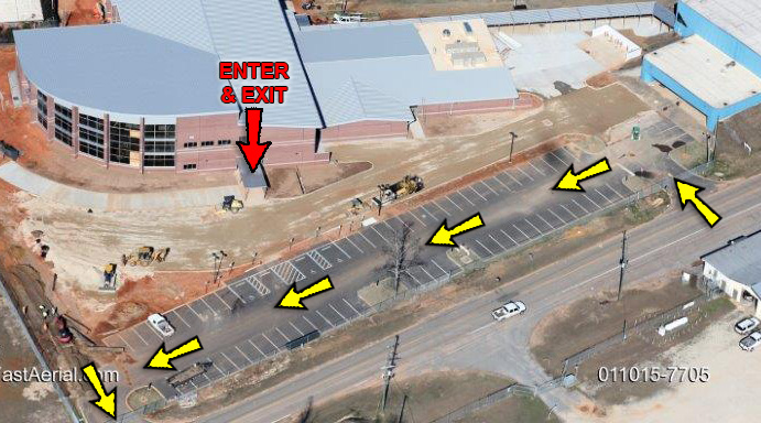 Parents entering or exiting the school building (such as to check out a student) will parking the pictured parking lot and use the door marked with the red arrow.