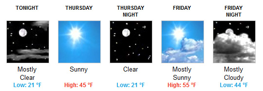 Mostly clear, with a low around 21. Northwest wind 5 to 10 mph.