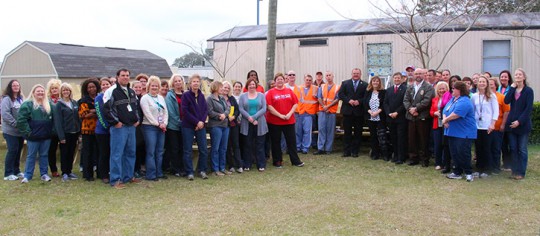 Pictured above and below: Century Correctional Institution inmates deliver new picnic tables built by the prison to Escambia Westgate School. Pictured bottom: Escambia Westgate staff, prison leadership, Superintendent Malcolm Thomas pose with some of the inmates. NorthEscambia.com photos, click to enlarge.