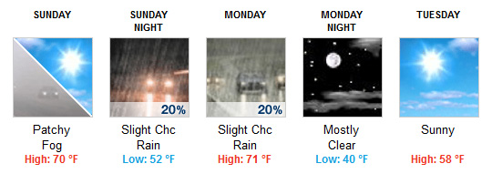 - Sunday Night A 20 percent chance of rain after midnight. Patchy fog after midnight. Otherwise, mostly cloudy, with a low around 52. South wind around 5 mph.