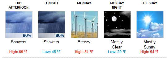 - Sunday Night Showers and possibly a thunderstorm before midnight, then a chance of showers. Low around 45. South wind 10 to 15 mph becoming northwest after midnight. Winds could gust as high as 20 mph. Chance of precipitation is 80%.