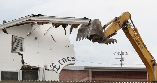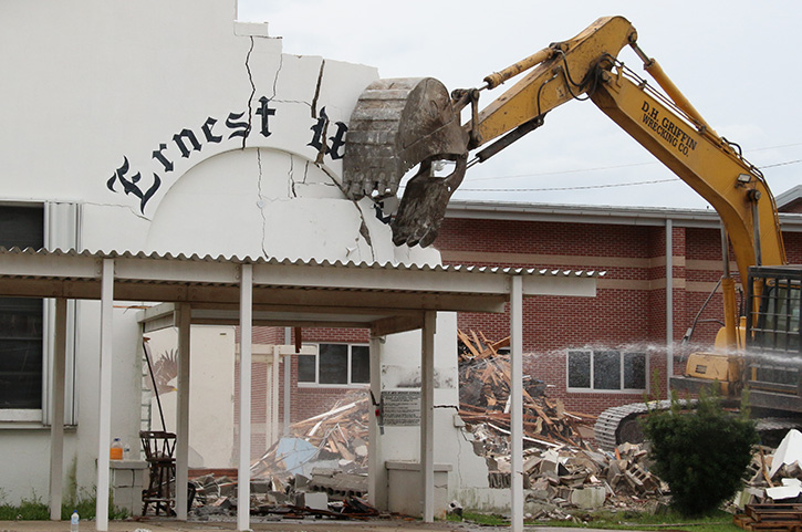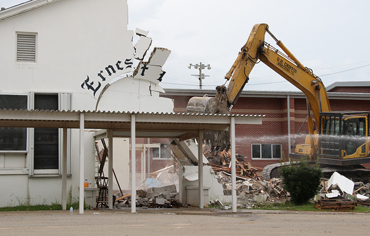 Demolition of the old Ernest Ward Middle School is almost compete. Thursday, crews demolished the former main entrance to the old Ernest Ward High School, including the landmark “Ernest Ward” script lettering over the door.
