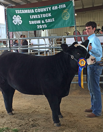 The 2015 Escambia (AL) County Calf and Heifer show started long before the audience actually saw the prize cattle. Early in the morning, the cows were brought into the stables to begin the grooming process, which includes bathing, brushing, blow drying and fluffing. The key ingredient for a making a cow beautiful? It’s shaving cream, which helps the hair puff out and become smooth and shiny.