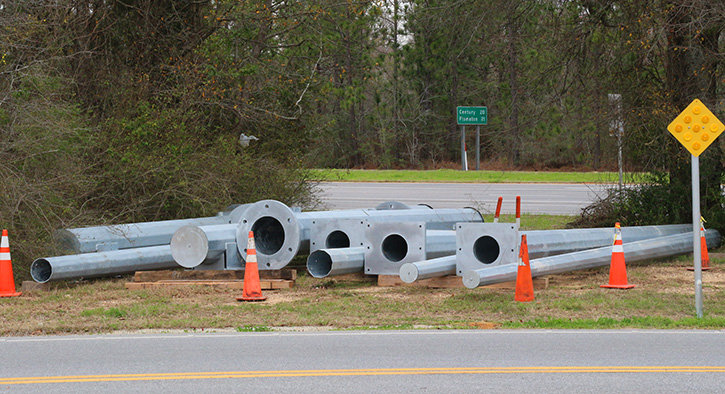 A delayed Florida Department of Transportation project to install a new traffic signal at the intersection of Highway 29 and Highway 97 in Molino saw some visible progress Monday as the support masts for the light were delivered.