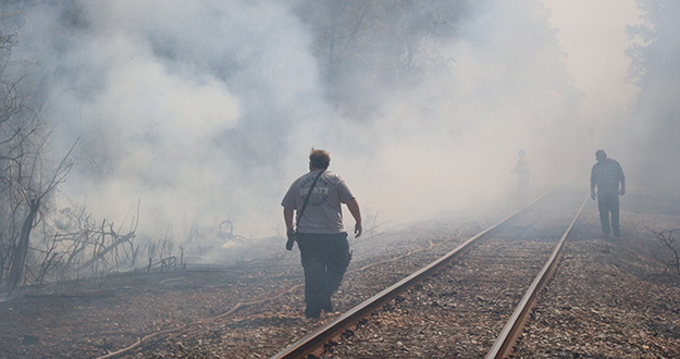 Pictured: Firefighters battle a brush fire along South Highway 99 and adjacent railroad tracks Sunday afternoon near Walnut Hill. NorthEscambia.com photos, click to enlarge.