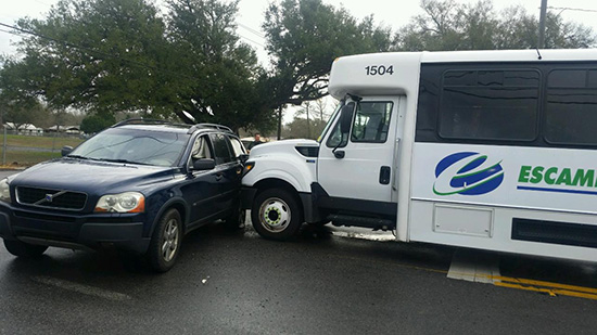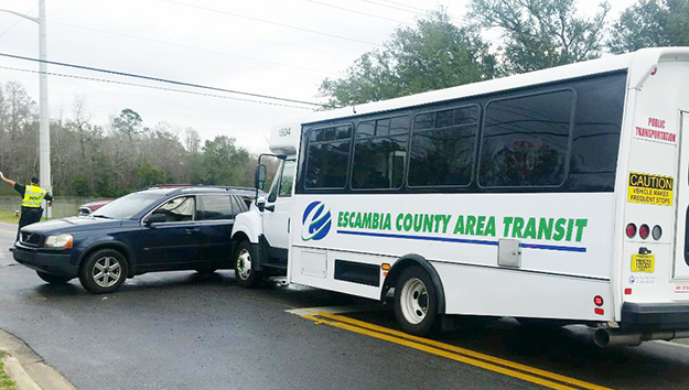 There were no serious injuries in a three-vehicle crash involving an Escambia County Area Transit bus this morning at West Detroit Boulevard and Untreiner Avenue. There were three passengers on the bus at the time of the crash; all were uninjured. The accident remains under investigation by the Florida Highway Patrol. NorthEscambia.com photos by Kristi Price, click to enlarge.