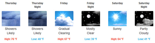 Showers likely and possibly a thunderstorm before 1am, then a chance of showers. Cloudy, with a low around 48. South wind 5 to 10 mph becoming northwest after midnight. Chance of precipitation is 60%.