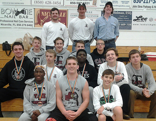 Pictured top: Tate wrestling team members (L-R) Daniel Pigg (4th place), Alex Porter (3rd place), Matthew Blalock (4th place), Gaven McAnally (1st place), Tanner Wood (2nd place), Heath Hernden (4th place) and Caleb Campbell (4th place). Pictured below: The Tate High School wrestling team at districts. Photos for NorthEscambia.com, click to enlarge.