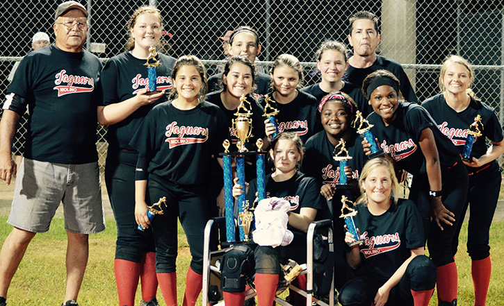 The Lady Jaguars coached by Donnie Nicholson and Mike King advanced to the championship game undefeated. After concluding the day after a five-hour rain delay, the Jags lost the first game of the championship series 5-4 before coming back strong in the second game with an 8-5 win over the East Milton Buckshots.