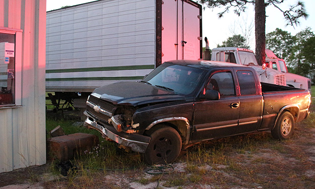 A pickup truck driver ran off the road Friday evening in Walnut Hill, hitting a parked semi-truck and almost colliding with a building.