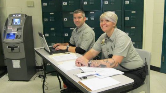 Pictured top: Two detention officers were posted in the lobby to the Santa Rosa County Jail Monday morning to assist with a new video visitation system that went live at 8 a.m. Photos for NorthEscambia.com, click to enlarge.